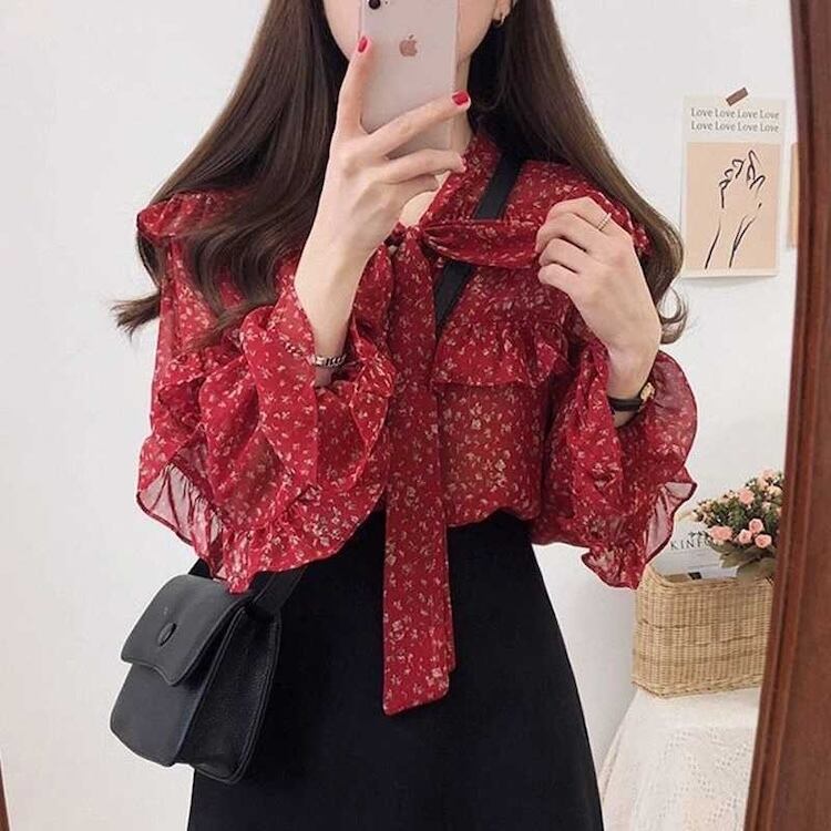 【送料無料】 レディース トップス ブラウス リボン フリル シアー シンプル カジュアル きれいめ 体型カバー 大人かわいい こなれ感 上品 長袖 レッド 赤 20代 30代 40代 通勤 通学 オフィス お出掛け 女子会 お呼ばれ 秋冬