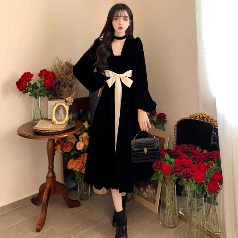 【送料無料】 レディース ワンピース Aライン ミドル丈 ミディアム丈 リボン スタイルアップ ふんわり袖 モノトーン ガーリー スウィート 大人かわいい シンプル カジュアル きれいめ こなれ感 体型カバー スタイルアップ 長袖 ブラック 黒 20代 30代 40代 通勤 通学 オフィス お出掛け 女子会 お呼ばれ 秋冬